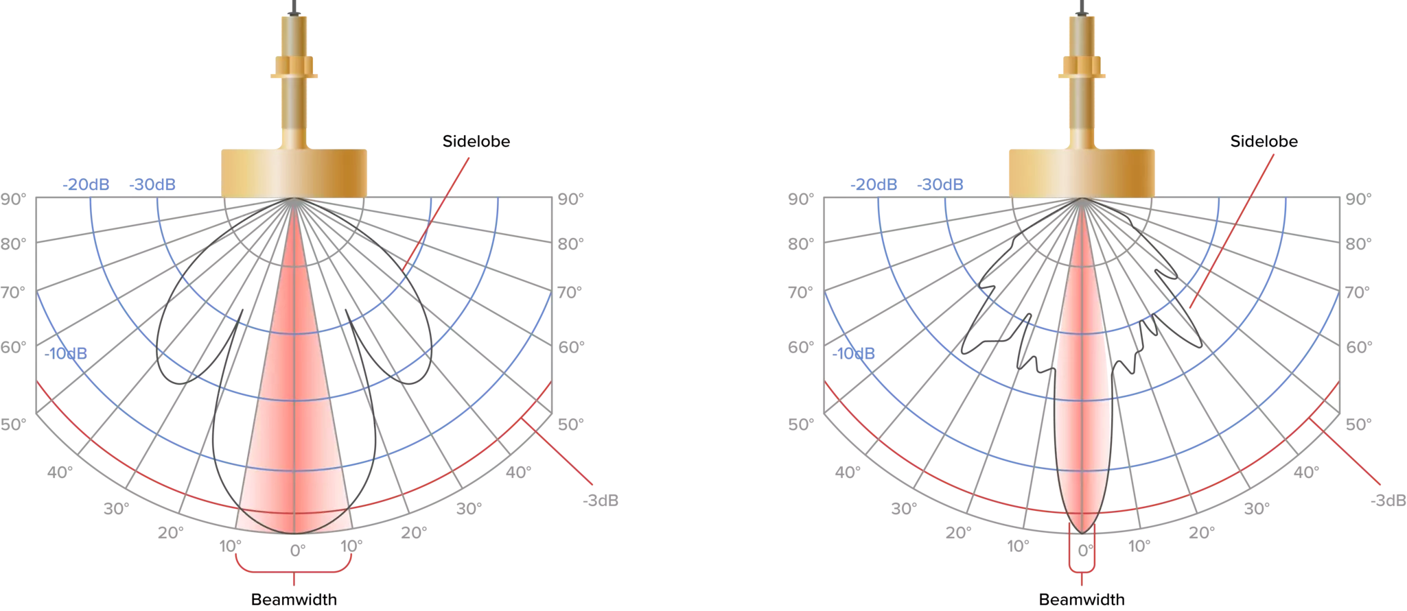 Преобразователь концентрирует передаваемый звук в луч. Теоретически излучаемый импульс распространяется как конус, расширяющийся по мере продвижения вглубь. В реальности формы лучей различаются в зависимости от типа преобразователя и обычно демонстрируют модели «боковых лепестков». На следующих рисунках графически представлены фактические модели излучения преобразователя.