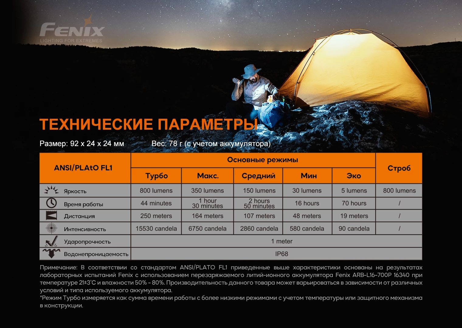 Эти показатели свечения модели были получены в процессе проведения лабораторных испытаний, где применяли литий-ионный аккумулятор 16340 Fenix ARB-L16-700P при температуре 21 +- 3 градуса Цельсия. Влажность воздуха достигала 50%-80%. Реальные параметры свечения фонаря могут отличаться от приведенных – в зависимости от условий внешней среды и применяемого аккумулятора.