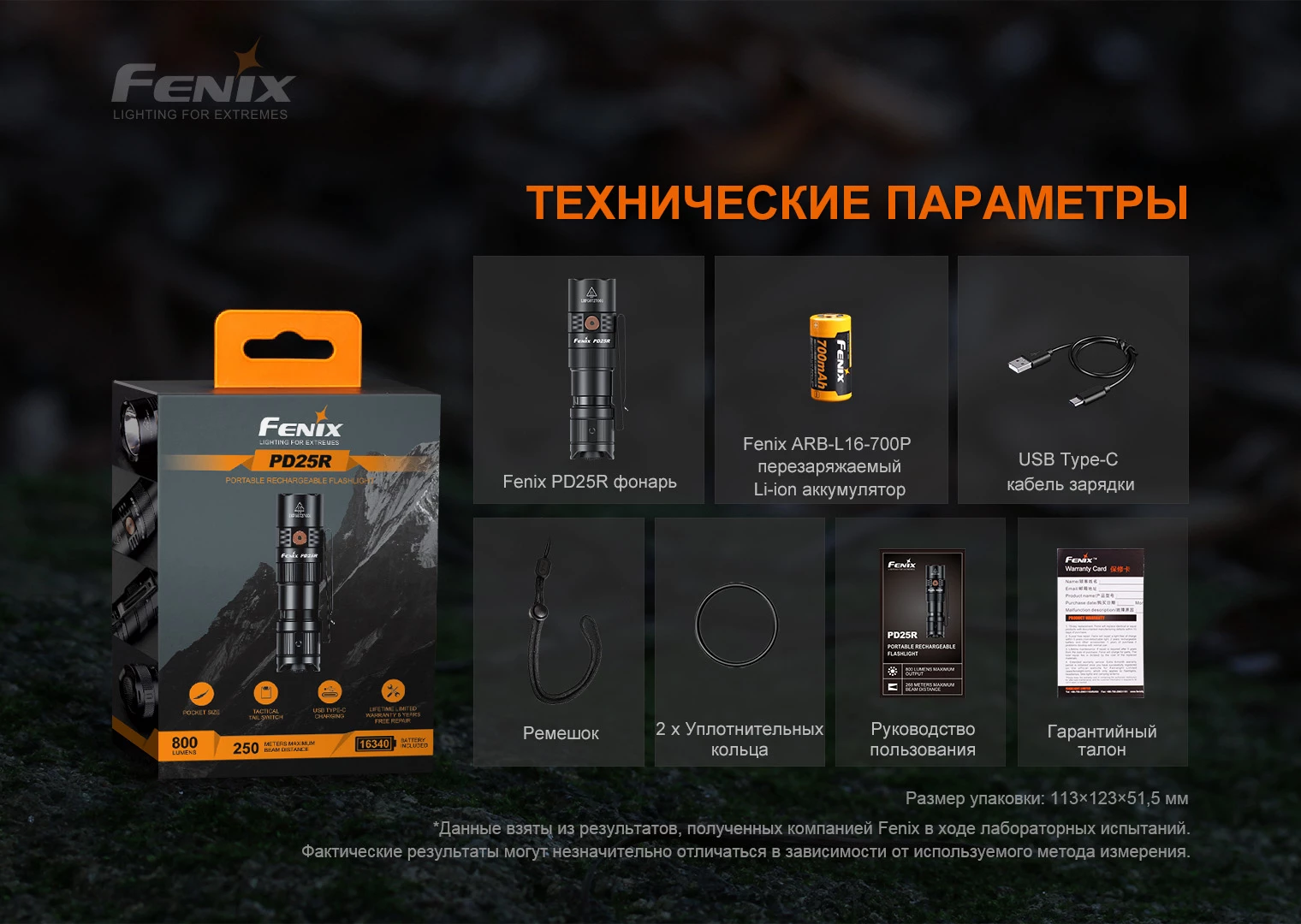 Модель фонаря Fenix PD25R, литий-ионный аккумулятор Fenix ARB-L16-700P, кабель USB Type-C, темляк, два запасных уплотнительных кольца, двухсторонняя клипса, инструкция пользователя, талон гарантии.