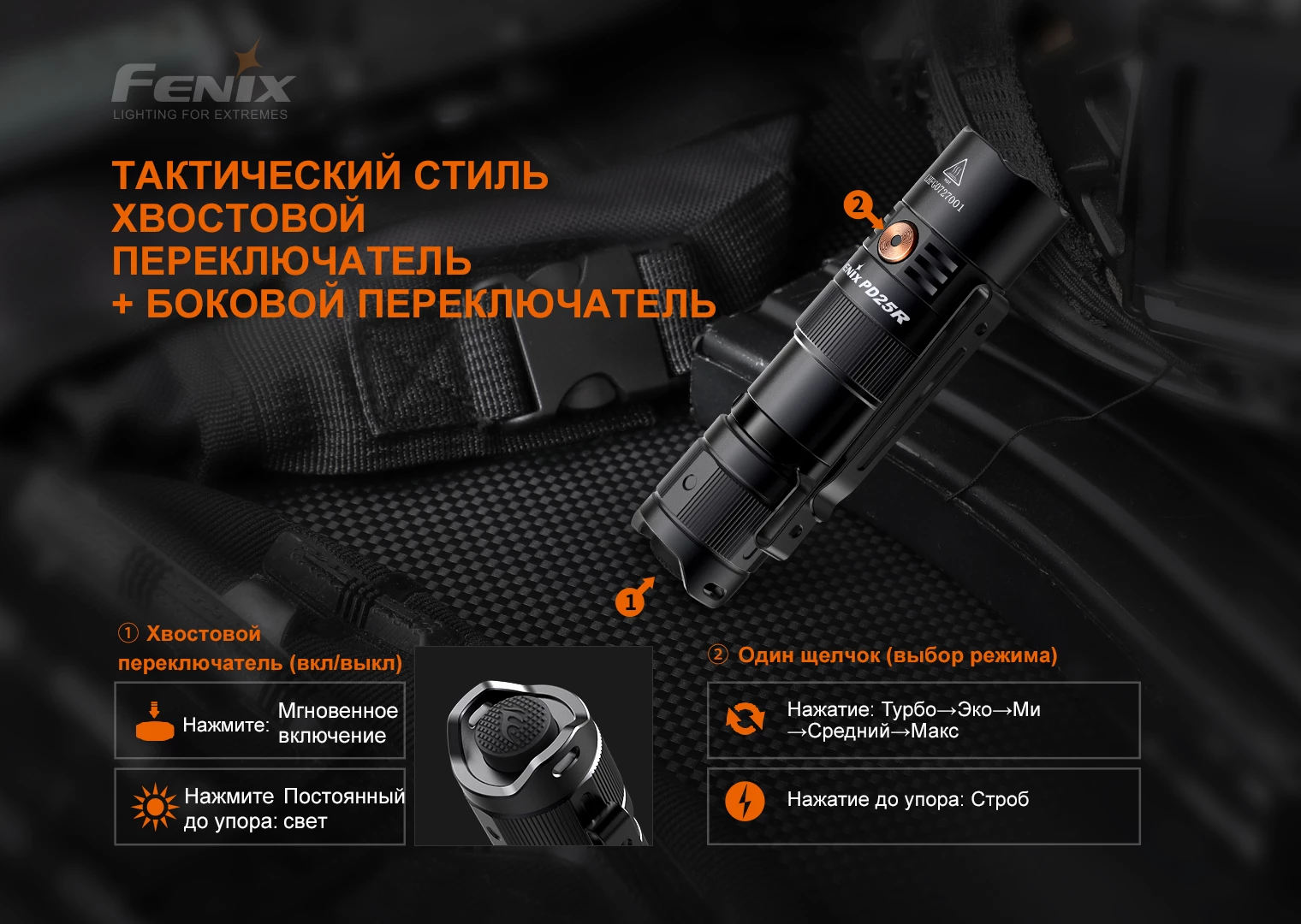 Для включения либо выключения фонаря нажмите на тактическую кнопку, находящуюся в хвосте корпуса. Это позволит тут же включить осветительный прибор. Если же отпустить – свет моментально выключится. Чтобы зафиксировать освещение, нажмите кнопку полностью, до щелчка. Переключение режимов: из включённого состояния фонаря зажмите и подержите переключатель сбоку где-то полсекунды. Запустится режим Стробоскопа. Затем щелкните повторно, чтобы возвратиться в режим постоянного света.