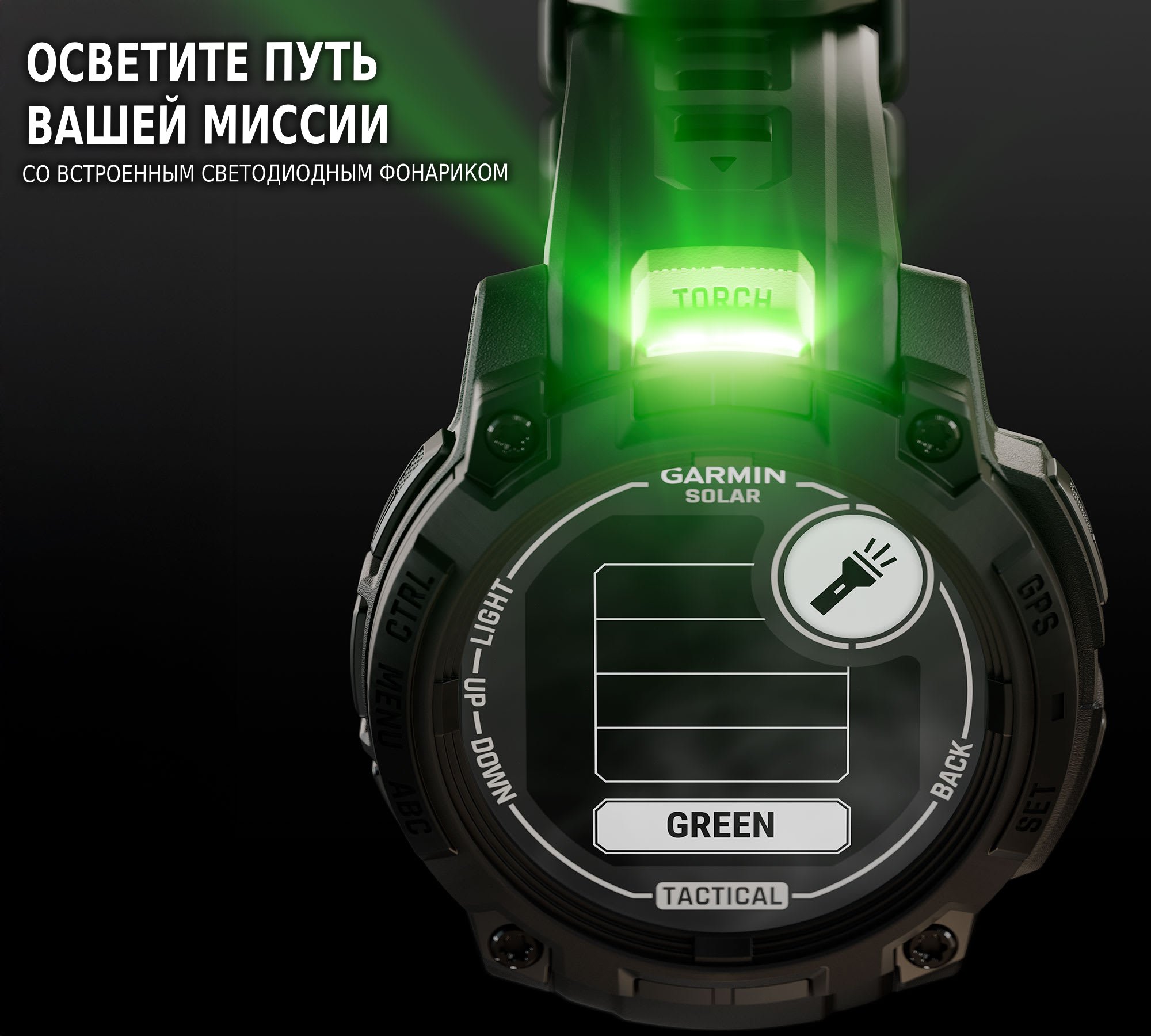 Специальные тактические функции включают в себя активность Jumpmaster, проекцию точек маршрута, двухпозиционный формат GPS, предварительно загруженные тактические активности, скрытый режим, аварийный выключатель и активность Rucking.